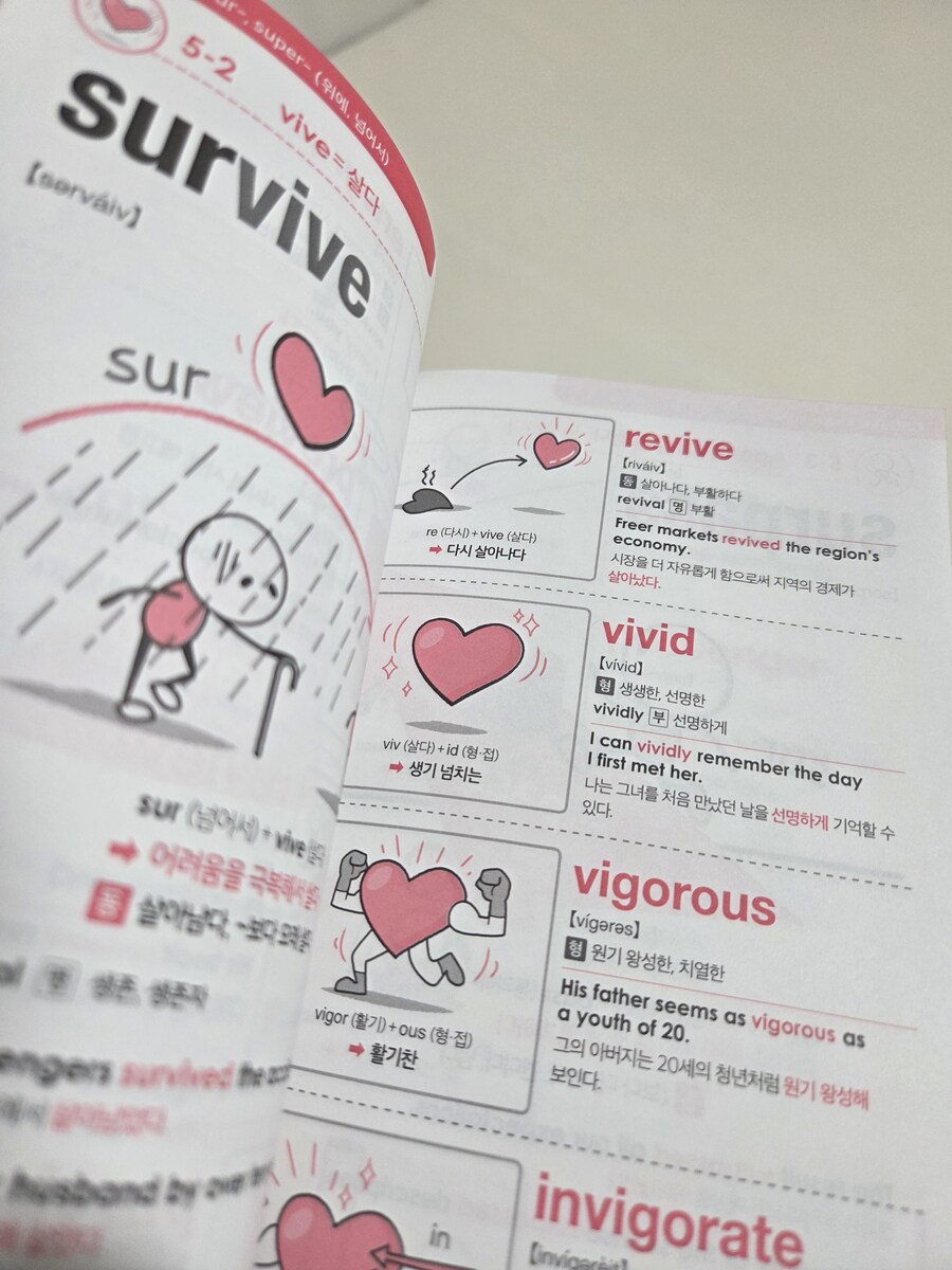 어원으로 영어공부를 하면 좋은 점, 세 가지를 저자는 짚어줍니다. 첫째, 효율적으로 기억된다. 둘째, 단어의 정확한 의미를 알게 된다. 셋째, 입체적 어휘의 네트워크가 구축된다. 이렇게 세가지 좋은 점을 나열하고 있습니다. 효율적으로 기억되고, 비슷한 단어와 어원의 차이를 명확히 알고 있으니 단어 의미의 차이를 인식하며 기억할 수 있고, 그러다 보니 관련 어원의 단어들로 어휘가 비약적으로 확장될 수 있다고 합니다. 본서는 일러스트와 함께인데다 분량이 많지 않아 많은 어휘를 담고 있지 않습니다. 게다가 기초 어휘네요. 본서와 플러스가 붙은 다른 책을 읽어보신 후 다른 어원 주제의 어휘서를 읽어보셔도 좋을 것 같습니다. 특히 아이들에게 권하면 좋아할 것 같아요. 맥락은 잡힐 것 같습니다.